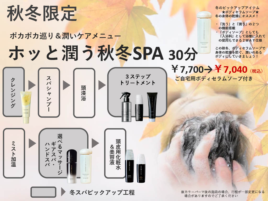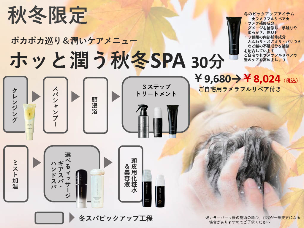 Lucocoでは、この季節に合わせた特別ケア「ホッと潤う秋冬SPA」をご用意しました。温めながらめぐりを整え、しっとりとした潤いを与える贅沢なヘッドスパ。頭皮と髪をやさしくケアし、深いリラックスをお届けします。